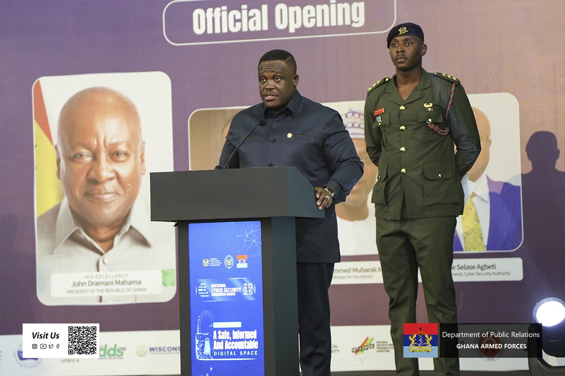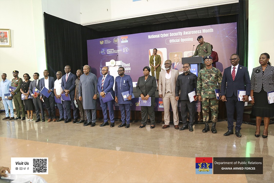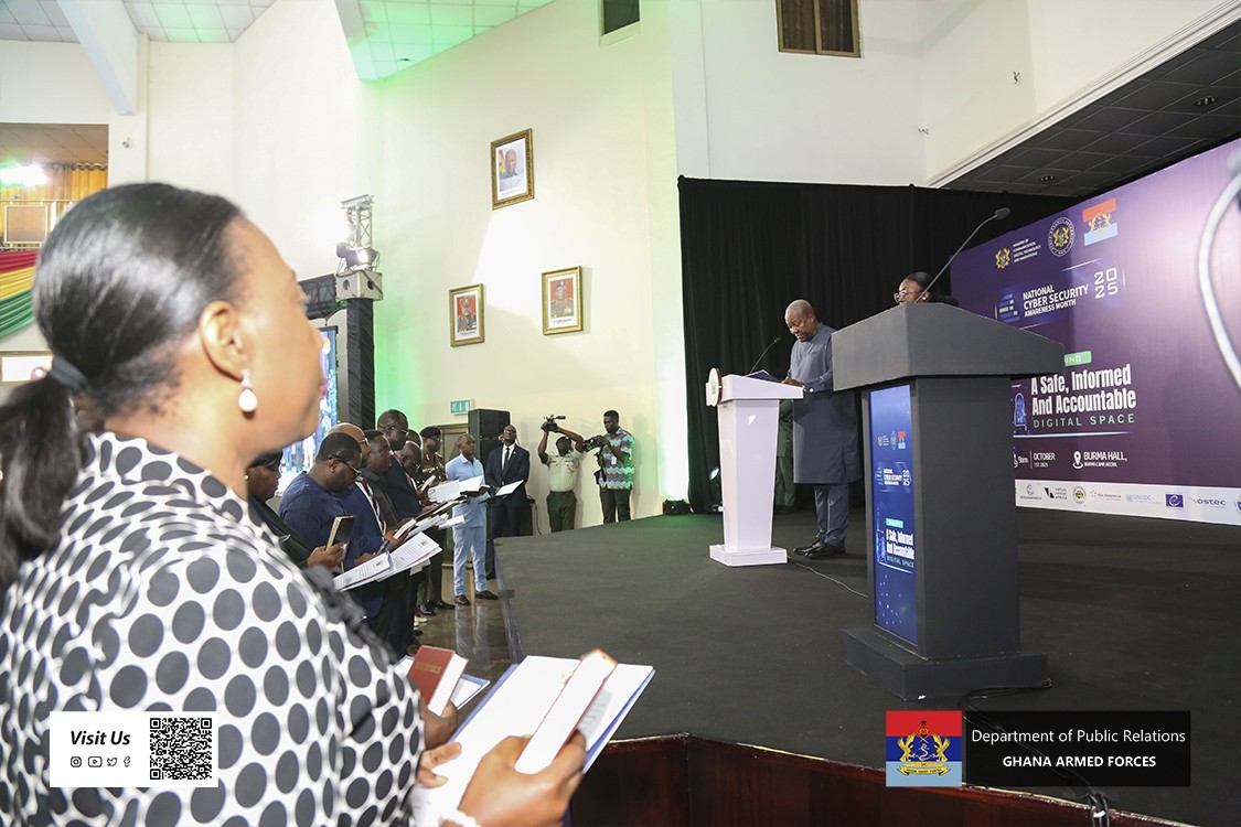 The President and Commander in Chief (C-in-C) of the Ghana Armed Forces, John Dramani Mahama has launched this year’s National Cyber Security Awareness Month under theme ‘Building a Safe, Informed and Accountable Digital Space’ on Wednesday, 1 October 2025 at Burma Hall. In his keynote address during National Cyber Security Awareness Month organized by the Ghana Armed Forces (GAF) in collaboration with the Cyber Security Authority (CSA), C-in-C expressed deep concerns about the growing threat of cybercrime in the country, highlighting the rise of sophisticated attacks such as mobile money scams, romance fraud, insider crimes within financial institutions among others. He assured Ghanaians that government is working closely with international partners and leveraging extradition treaties to track, arrest and prosecute offenders whether local or foreign. President Mahama indicated that the awareness month would play a vital role in equipping citizens with the knowledge to safeguard themselves and contribute to the goal of creating a secure inclusive, and resilient digital environment in the country. He further announced the inauguration of the Joint Cybersecurity Committee (JCC) to ensure unified national defence and disclosed the intention to ratify the United Nations Convention on Cybercrime. He noted that most cyber breaches stem from human error, hence, urged all to stay vigilant and well-informed. The Minister for Communication, Digital Technology and Innovations, Honourable Samuel Nartey George noted that there are 24.3 million internet users in Ghana, therefore, cyber threats are inevitable. Adding that the annual awareness campaign has thus evolved into a crucial national initiative. He stated that the Ministry is coordinating incident response framework, which includes sector-specific cybersecurity ecosystems for banking, telecommunications, government, and national security. The Interior Minister, Honourable Mohammed Mubarak Muntaka stated that the launch reflects national commitment to building a safe and resilient digital space. He added that security agencies remained steadfast in addressing these challenges, with the Ghana Police Service playing a pivotal role. He specified that the Police Cyber Crime Unit successfully arrested 68 suspected criminals, identified 108 victims, and seized over 885 electronic devices, demonstrating an unwavering commitment to securing Ghana’s digital space and contributing to the global fight against cybercrime. The Acting Director-General, Cyber Security Authority, Mr Divine Selase Agbeti said Ghanaians must actively engage in improving digital literacy and promoting responsible online behaviour. He reported significant progress by CSA in cracking down on cybercrime and related offenses, including cross-border kidnapping, money laundering through cryptocurrency fraud and online romance scams.