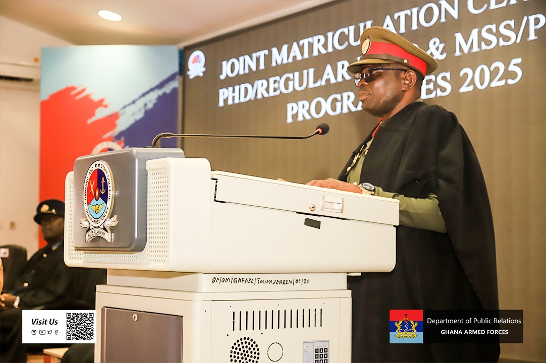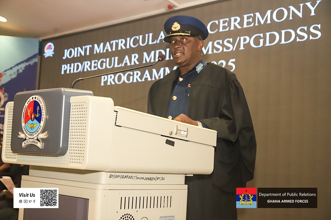 The Guest of Honour, President of the National Defence University (NDU), Air Vice Marshal (AVM) Felix Adom Asante, advised the matriculants to be innovative and focused on their studies. He encouraged them to stay dedication so as to ensure their personal success and contribution to the global community. AVM Asante further explained that matriculation was not a mere ceremonial rite of passage but a call to excellence. He encouraged the students to approach their studies with commitment by carefully planning their academic activities, anticipate challenges and staying resilient in their studies. In his welcome address, the Acting Commandant of GAFCSC, Brigadier General (Brig Gen) Jackson Wonje, congratulated the matriculants and reminded them that their admission was both a privilege and a responsibility. He emphasised the need to uphold integrity and meet the high academic and moral standards of the College as part of their growth. Brig Gen Wonje further highlighted the importance of unity and teamwork, urging the students to remain steadfast in serving God and country. He reiterated that the legacy of GAFCSC was built on the shared values of sacrifice, integrity and service and encouraged the matriculants to embody these principles within and beyond the College. The Ghana Armed Forces Command and Staff College (GAFCSC) has held a joint matriculation ceremony for students of the Doctor of Philosophy (PhD), Regular Master of Science in Defence and International Politics (MDIP) and Master of Science in Security Studies (MSS) programmes on Wednesday, 1 October 2025 at Hamidu Hall, Otu Barracks.