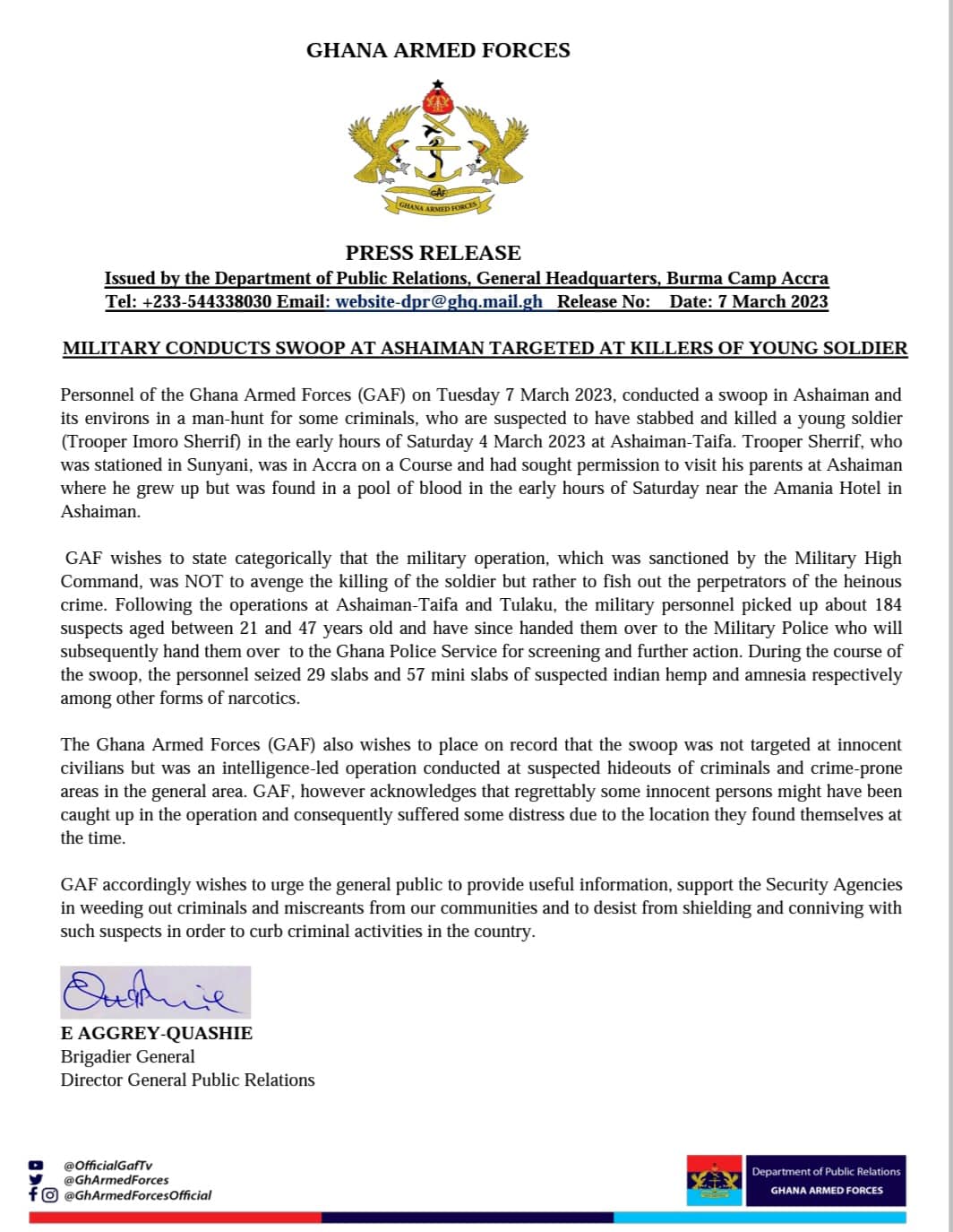 MILITARY CONDUCTS SWOOP AT ASHAIMAN TARGETED AT KILLERS OF YOUNG SOLDIER
