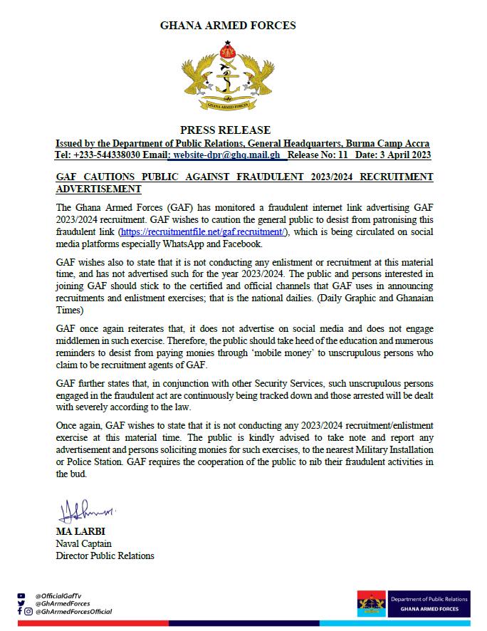 GHANA ARMED FORCES CAUTIONS PUBLIC AGAINST FAKE PRESS RELEASE ON RECRUITMENT